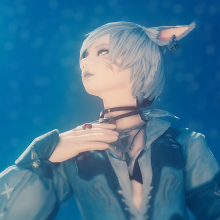Standing at five fulms, four ilms, X'shasi is on the taller side for a Seeker. Perhaps her most striking feature is her eyes, which are a brilliant blue similar to the shade of aetheryte crystal—or indeed the selfsame color as the Mothercrystal, to those who have been in the presence. Her hair is a light silver-grey color, though the tips of her ears and tail are white. She bears the usual clan markings, ruddy in color against her pale skin. On her left cheek there is a straight, clean scar.Her build is lithe and trim, like much of her race, though the broadness of her shoulders and back and the definition of her arms betrays uncommon upper-body strength. She seems to prefer knee-high boots and thick, thigh-high stockings. Her garb favors mobility over durability—even in armor it’s lighter than one might expect.She usually carries one of two blades—a light, filigreed foil with red enamel detailing around the basket and a matching arcane focus that betrays a facility with red magic, or else an undecorated slab of steel with a leather-wrapped handle worn smooth with use above the sturdy crossguard. It’s almost as long as she is tall, and demands the use of both hands, so she bears no shield.Shasi is heavily laden with jewelry, and its appearance seldom changes. She wears a pair of earrings with rounded amethyst cabochons, and molded to the curve of the violet stones are gryphons of silver bearing blades of turquoise—the heraldic charge of Ala Mhigo. Her right ear is pierced a second time, and she wears a silver hoop with a pendant blue crystal—the same color as her eyes. On her right index finger, she wears a silver signet ring set with an onyx stone. It is graven with the device of a unicorn, and the stone seems a bit overlarge for her hands, as though she had to size the band down. On the ring finger of that same hand is a band of heavy gold, hammered to fit around an opaque shard of what looks like milky violet glass.Her posture is one of readiness, ears perked and alert. She has a confident, graceful stride, and her expression is patient and thoughtful. It takes a careful examination to note the tiredness in her eyes.