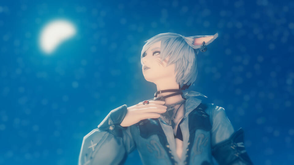 Standing at five fulms, four ilms, X'shasi is on the taller side for a Seeker. Perhaps her most striking feature is her eyes, which are a brilliant blue similar to the shade of aetheryte crystal—or indeed the selfsame color as the Mothercrystal, to those who have been in the presence. Her hair is a light silver-grey color, though the tips of her ears and tail are white. She bears the usual clan markings, ruddy in color against her pale skin. On her left cheek there is a straight, clean scar.Her build is lithe and trim, like much of her race, though the broadness of her shoulders and back and the definition of her arms betrays uncommon upper-body strength. She seems to prefer knee-high boots and thick, thigh-high stockings. Her garb favors mobility over durability—even in armor it’s lighter than one might expect.She usually carries one of two blades—a light, filigreed foil with red enamel detailing around the basket and a matching arcane focus that betrays a facility with red magic, or else an undecorated slab of steel with a leather-wrapped handle worn smooth with use above the sturdy crossguard. It’s almost as long as she is tall, and demands the use of both hands, so she bears no shield.Shasi is heavily laden with jewelry, and its appearance seldom changes. She wears a pair of earrings with rounded amethyst cabochons, and molded to the curve of the violet stones are gryphons of silver bearing blades of turquoise—the heraldic charge of Ala Mhigo. Her right ear is pierced a second time, and she wears a silver hoop with a pendant blue crystal—the same color as her eyes. On her right index finger, she wears a silver signet ring set with an onyx stone. It is graven with the device of a unicorn, and the stone seems a bit overlarge for her hands, as though she had to size the band down. On the ring finger of that same hand is a band of heavy gold, hammered to fit around an opaque shard of what looks like milky violet glass.Her posture is one of readiness, ears perked and alert. She has a confident, graceful stride, and her expression is patient and thoughtful. It takes a careful examination to note the tiredness in her eyes.
